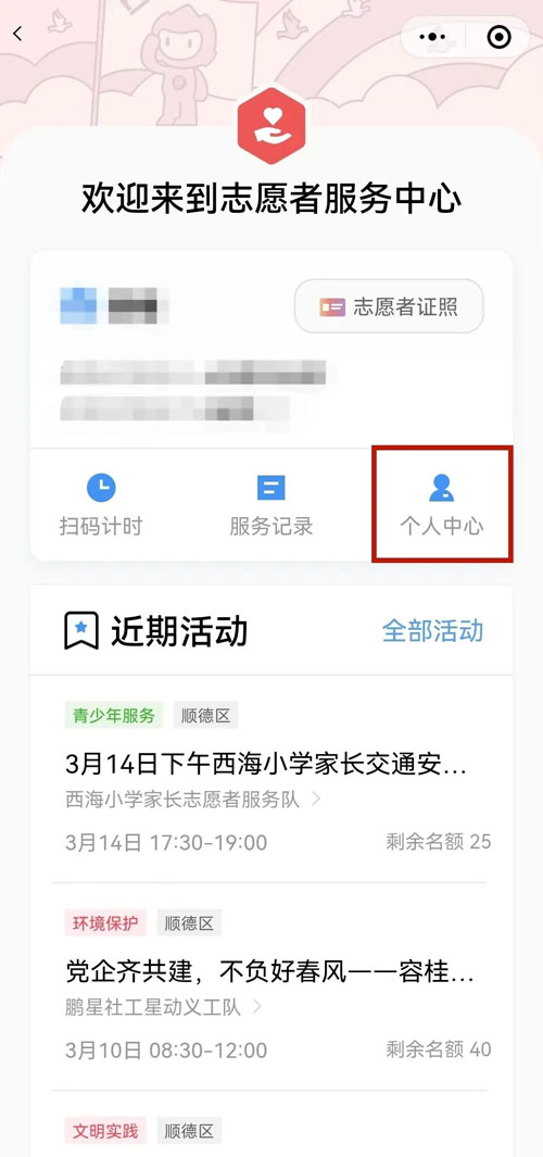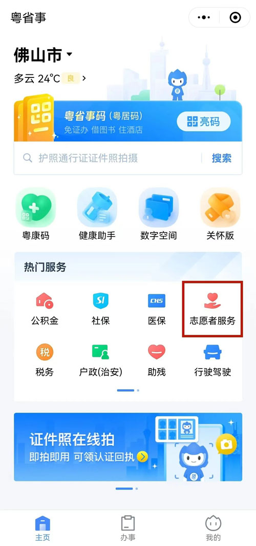 第一步:进入“粤省事”小程序,点击“志愿者服务”。