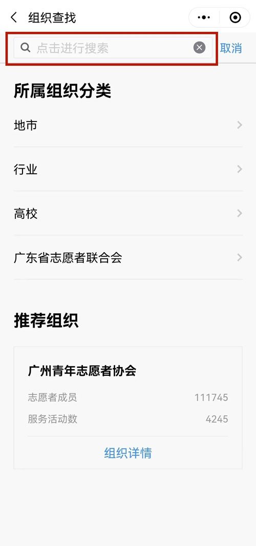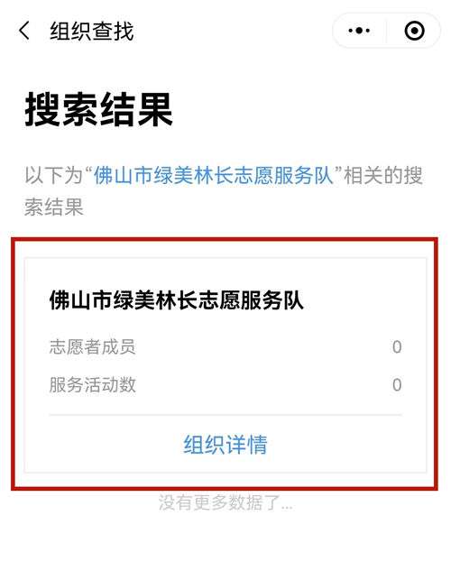 第四步:在搜索框里搜索“佛山市绿美林长志愿服务队”。