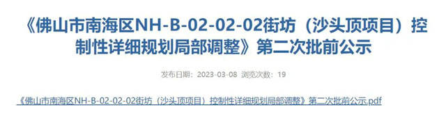 3月8日,南海区人民政府网发布了《佛山市南海区NH-B-02-02-02街坊(沙头顶项目)控制性详细规划局部调整》第二次批前公示,调整范围恰好在创客产业中心旁,此次调整是为了日后建设6号线预留用地。