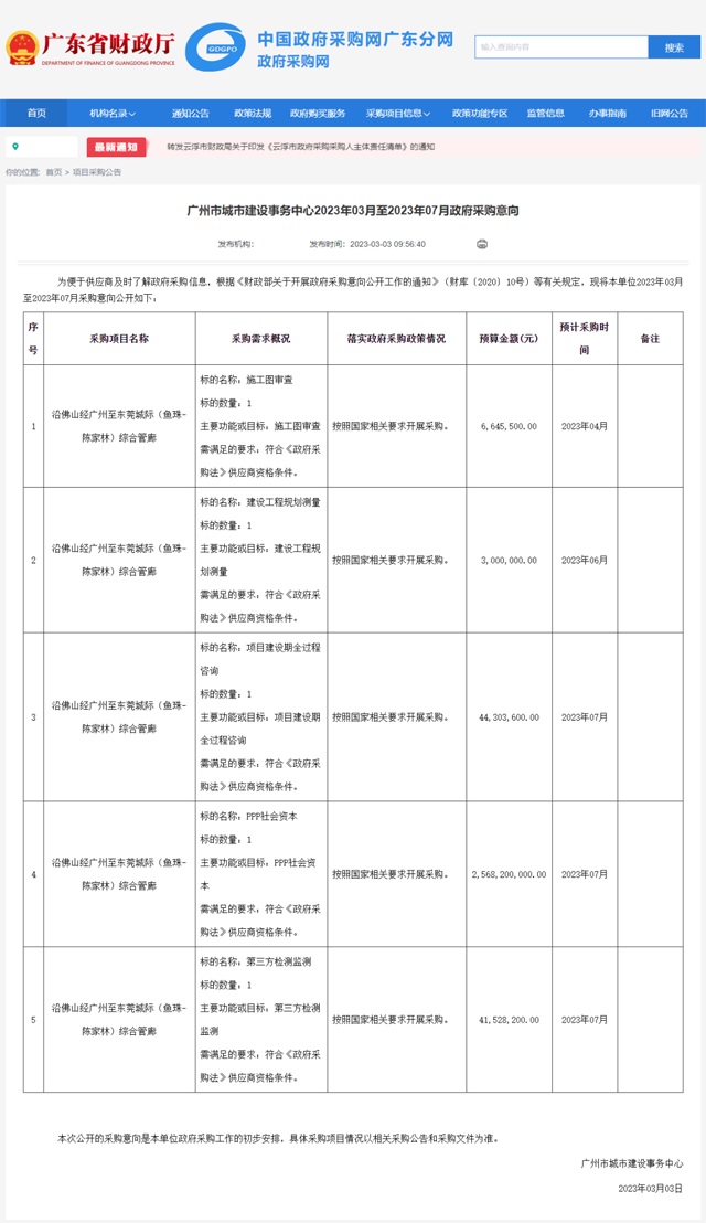 除了佛山6号线外,根据规划,佛穗莞城际被纳入《广州市2023年重点建设项目计划》,明确表示该线路今年动工。3月6日,佛穗莞城际鱼珠—陈家林路段率先发布招标,包含施工图审查、建设工程规划测量、建设全过程咨询等内容,总成本约26.6亿。