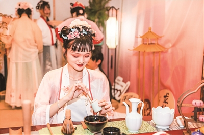 美陶湾“游朱紫 大红大紫”岭南民俗活动现场表演宋代点茶。