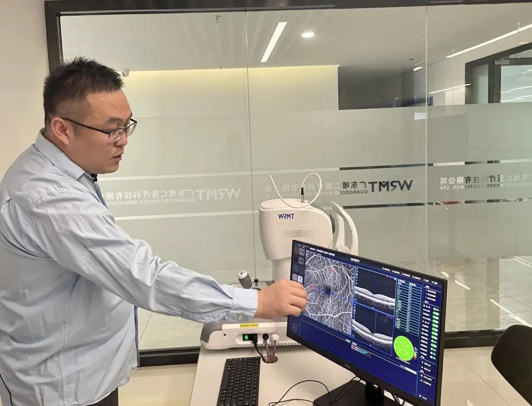 在唯仁医疗的智能医学影像室,工作人员熟练进行操作,向来客展示主打产品的先进功能。受检者坐到设备前,只需半分钟,便扫描得出眼底断层及血流等一系列高清图像。