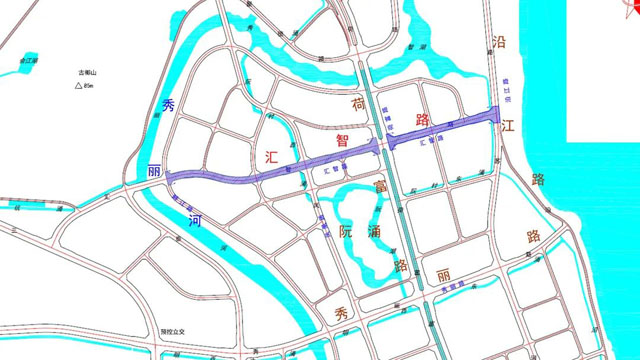 畔江路位于西江产业新城北片区,路线呈南北走向,起点交于秀丽路,终点交于汇智路,道路全长约1.3公里,双向4车道。道路等级为城市支路,计算行车速度30km/h,道路宽度24m。