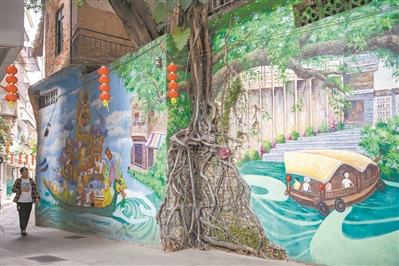 春日的阳光照进泮塘五约直街,透过树叶,在地上洒下点点光影。蜿蜒的古巷,街坊三三两两唠着家常,每走几步,或是一家文艺小店,或是一个传统文化工作室,或是新概念的创新空间,随处可见的手绘壁画仿佛带你穿越回旧时西关。“出门见生活,进门品艺术”,古村风貌与个性时尚,烟火气和文艺范,在这里找到了平衡。