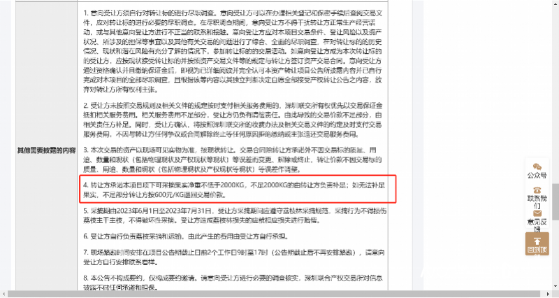 南都记者留意到,目前深圳联合产权交易所官网发布了莲花出水农科小镇三百颗公司荔枝果实采摘权转让公告,此次采摘权的转让,不设置资格条件,人人皆可以参与,参与交易需缴纳保证金36万元。此外,转让方承诺本项目项下可采摘果实净重不低于2000KG,不足2000KG的由转让方负责补足;如无法补足果实,不足部分转让方按600元/KG退回交易价款。