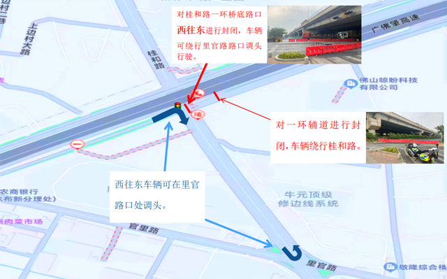 对桂和路一环桥底路口西往东进行封闭,车辆可绕行里官路路口调头行驶。