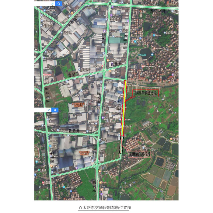 为确保施工质量和安全,2023年3月20日至2023年4月24日,百太路东局部道路封闭一条车道施工,另一条车道单向行驶;百太路东的稔新线至朝阳路口段封闭施工,除内部厂企车辆外禁止进入,届时,请过往车辆注意绕行及按交通指引减速行驶。施工期间造成道路通行能力下降,不便之处敬请原谅。