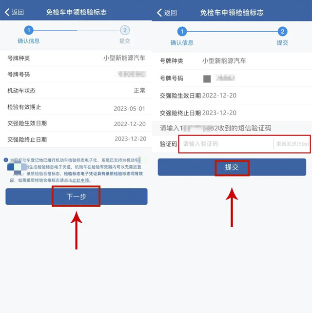 ❷ 核实车辆信息,确认无误后点击【下一步】,获取验证码,输入验证码并提交申请,即可获得检验标志电子凭证。