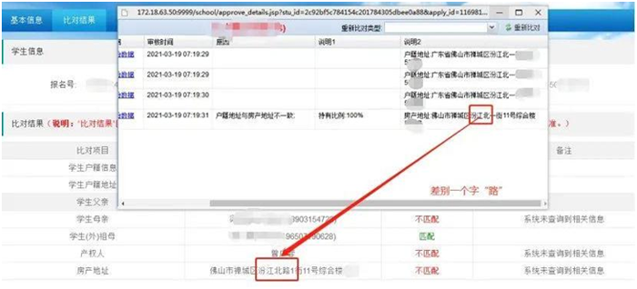 例如:多加了小区名(通常房产地址都不会出现小区名字的),或者家长填报的房产地址多字、少字、错别字。