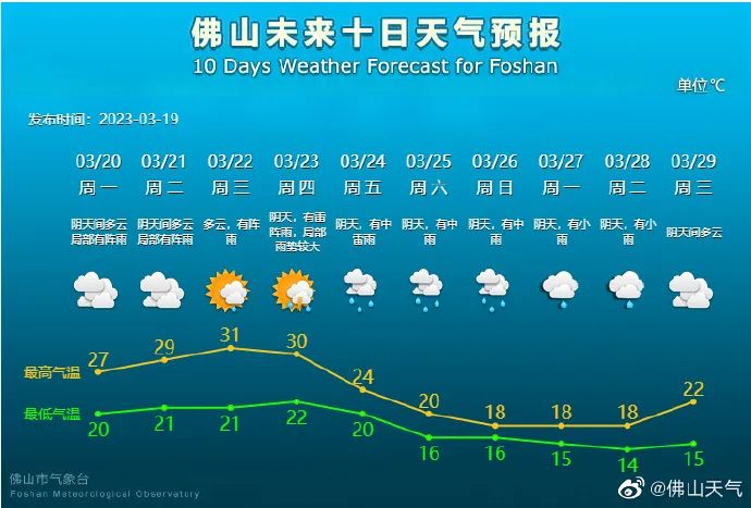 据佛山气象局预报,未来一周,佛山以阴雨天气为主,间中有雷电。其中,明后两天佛山阴天间多云,局部有阵雨,早晚有轻雾;23号佛山阴天,有雷阵雨,局部雨势较大。