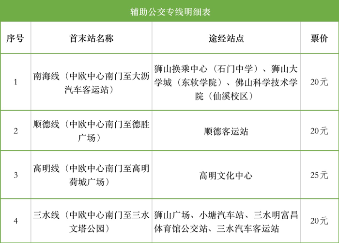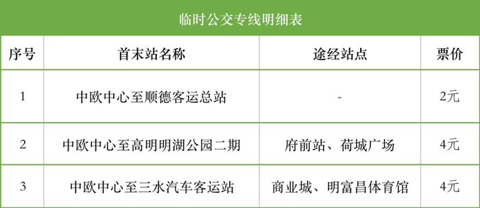 分别开通中欧中心至顺德、高明、三水共3条临时公交专线,加强公交疏散能力,临时公交专线服务时间为18:00-22:00,投放车辆50台,班次密度为20分钟/班,具体线路明细如下: