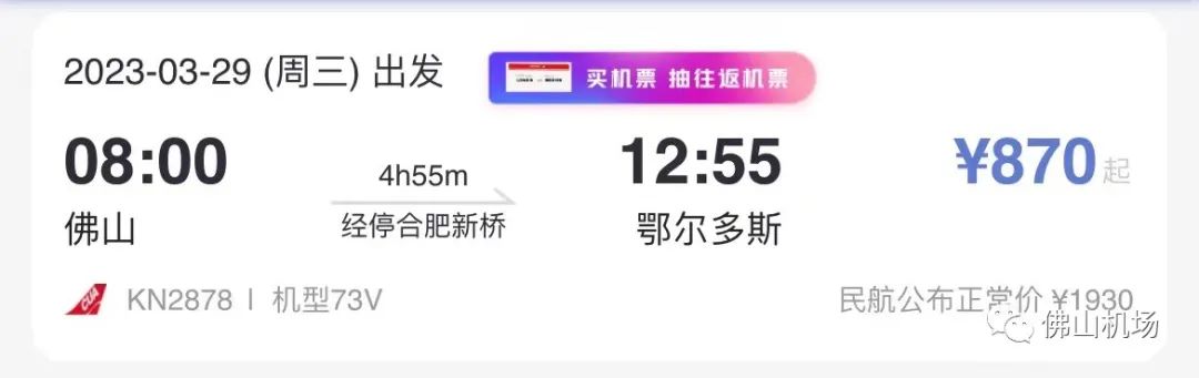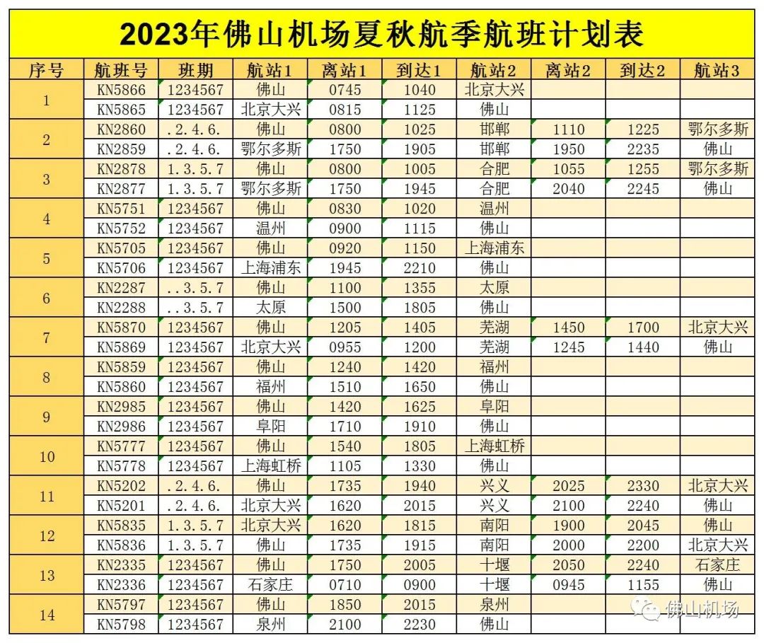 3月26日起,佛山机场开始执行夏秋换季航班计划。根据旅客需求,计划新增佛山=兴义=北京大兴航线,同时也恢复了佛山=合肥=鄂尔多斯航线。