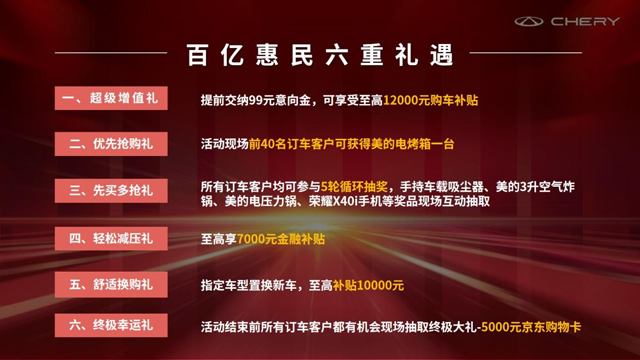本次团购会现场,奇瑞针对全系车型推出了极具优惠力度的六重礼政策: