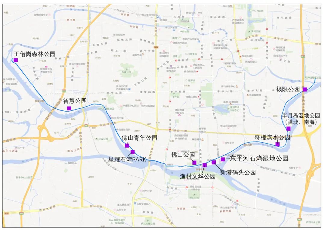 12个景观公园自西往东分别为:王借岗森林公园、智慧公园、佛山青年公园、星耀石湾PARK、佛山公园、渔村文华公园、新港码头公园、东平河石湾湿地公园、奇槎滨水公园、半月岛湿地公园(禅城、南海)、极限公园。
