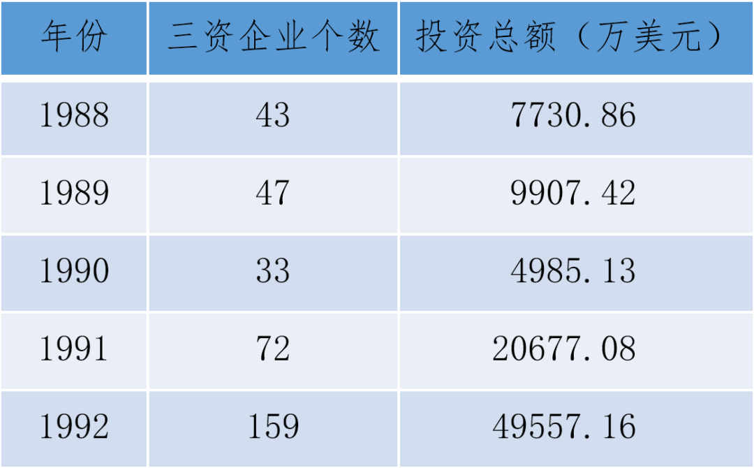 20世纪80年代末,“三资”企业在南海已有一定程度的发展。1990年,受前期外部环境的影响,全县“三资”企业数量和投资总额出现明显下滑,其中投资总额降幅接近50%。至1991年开始有明显好转,“三资”企业数量同比增长1倍多,投资总额猛增3倍多。“三资”企业在南海开始迅猛发展。同年,南海县外贸收购总额突破10亿元大关,达11.05亿元。