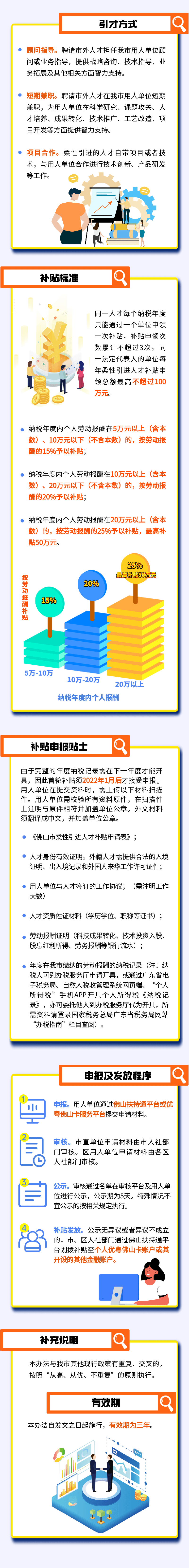 为建立更加开放、更加灵活、更加自由的人才引进和使用机制,重点引进我市经济社会发展各领域急需紧缺人才,2021年4月我市出台了《佛山市柔性引才暂行办法》,首轮补贴已于2022年1月开始接受申报,符合申报条件的人才请通过优粤佛山卡APP进行申报。