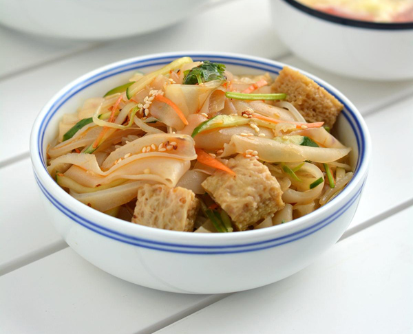 凉皮虽说凉拌着吃,辅助着大蒜水,辣椒油,糖,醋,香麻油,黄瓜、焯水后的绿豆芽,口味更加爽口,即使在冬天也桌上常见的美味佳肴。