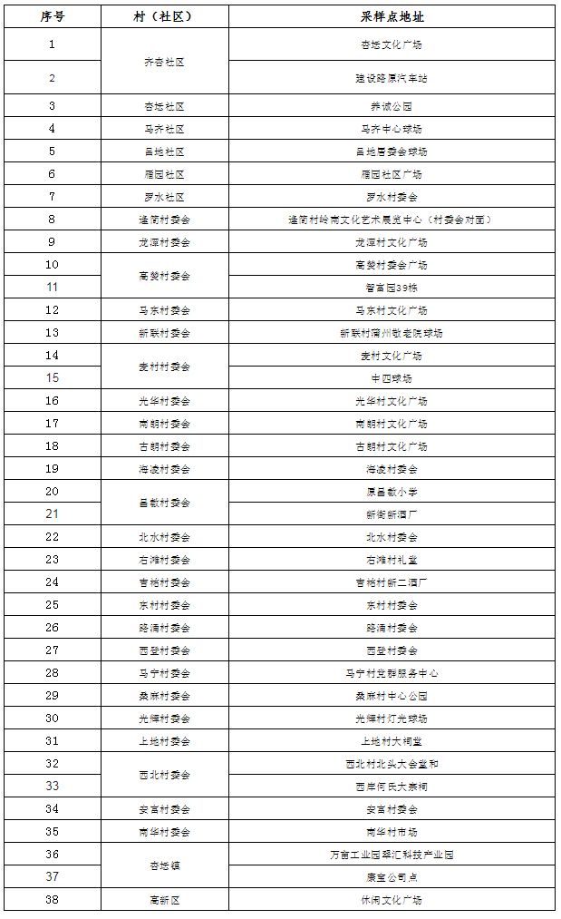 二、全镇分区域设38个采样点,具体地点详见附件。请及时就近进行检测,做到“应检尽检”。