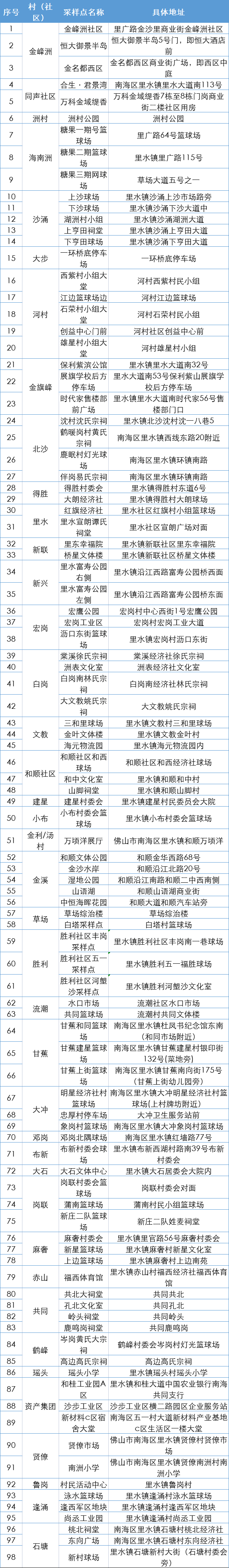 第二批检测时间:4月11日参与村(社区):邓岗、北沙、大石、赤山、流潮、甘蕉、大冲、麻奢、里水、宏岗、岗联、布新、瑶头、汤村、小布、贤僚、鲁岗、鹤峰、草场、洲村、河村、得胜、新联、新兴、胜利、沙涌、大步、金旗峰、金峰洲、海南洲、同声、沙步工业园采样点、新材料C区宿舍大堂、逢涌、石塘、和桂工业园