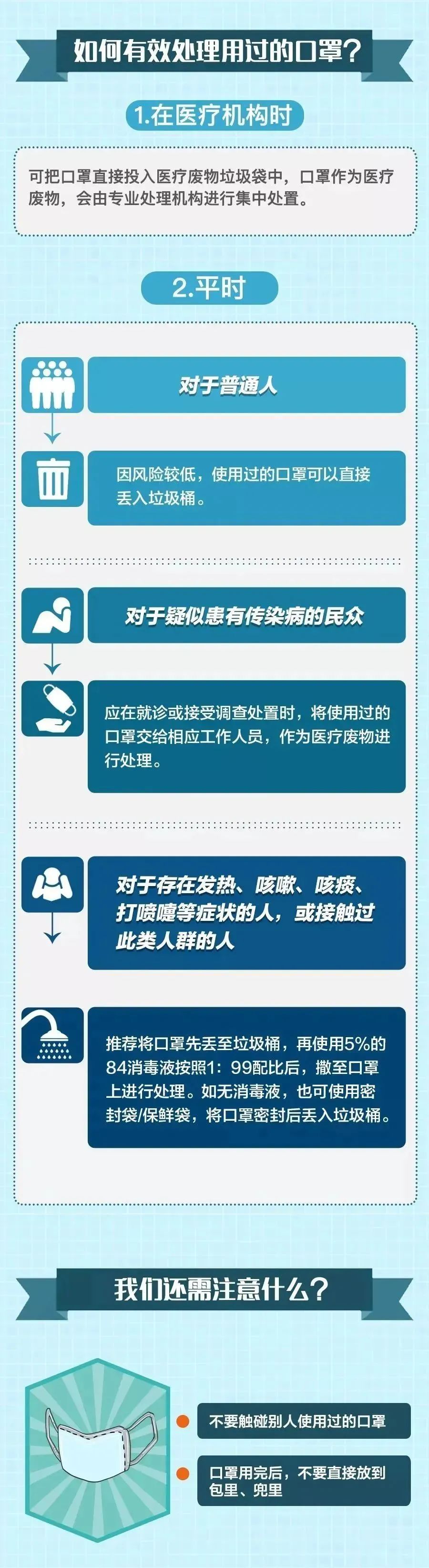 疑似病例或确诊患者佩戴的口罩,不可随意丢弃,应视作医疗废弃物,严格按照医疗废弃物有关流程处理。