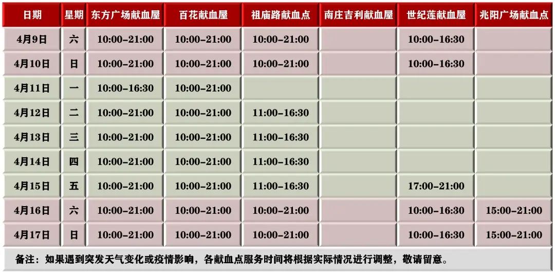 您好!本周二至周五,东方广场献血屋和祖庙路献血点的服务时间有所调整,请以下图所示为准。对您造成的不便,请多多包涵。