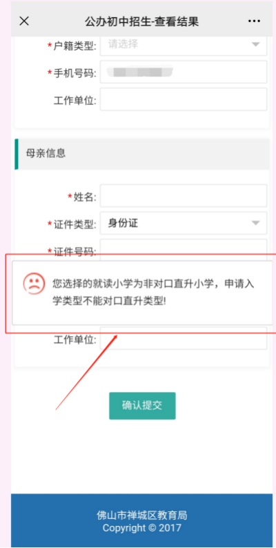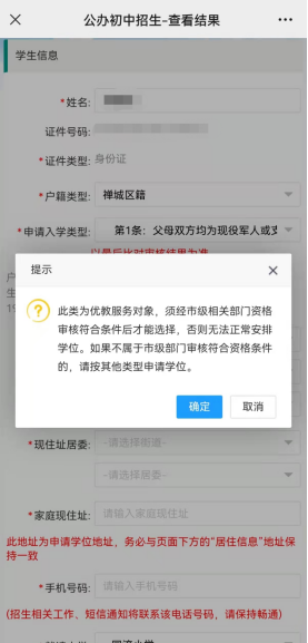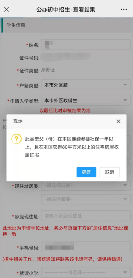 注意:家长选择的“就读小学”必须是具有对口直升政策的学校。若所选的“就读小学”没有对口直升政策则系统会弹出提示框,提示家长(如下图)。