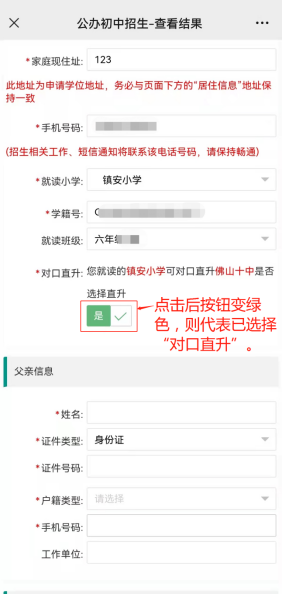 (1)网上报名时“申请入学类型”选择“对口直升户籍生”或“对口直升借读生”。在“对口直升”处选择“是”。