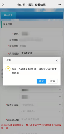 ①家长选择的“房屋类型”是“规定范围改造项目拆迁户”“租用经济适用房、公租房、廉租房等保障住房中心的公共租赁住房”“租住所属单位产权住房”“挂靠房或集体户”“租住私人住房或无固定住房”的,系统均查找不到相关信息。此类情况需要到现场提交相关证明材料原件进行核验。