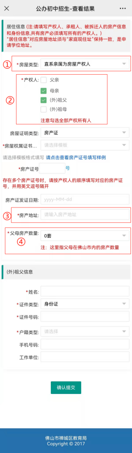 ④“父母房产数量”的填写:是指新生父母在佛山市内的房产数量。可选:“0”“1套”或“1套以上(不含1套)”。