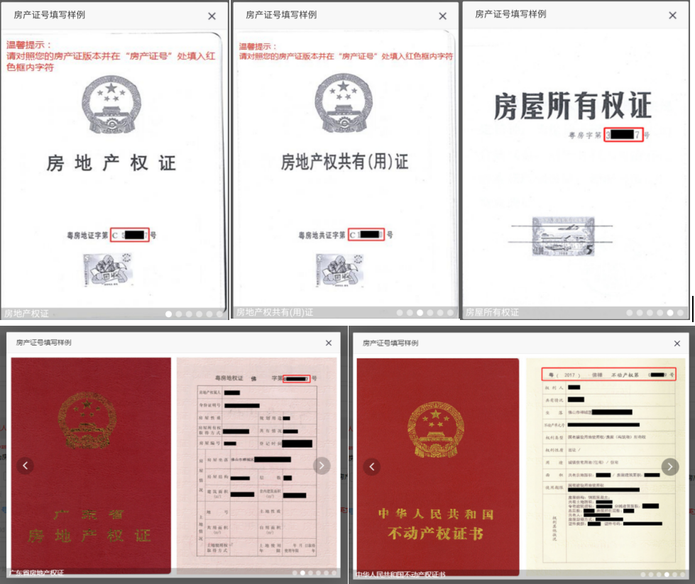 附:各类房产权属证书填写样例(请家长对照所持有的房产权属证书类型并在“房产证号”处填入红色框内字符)。