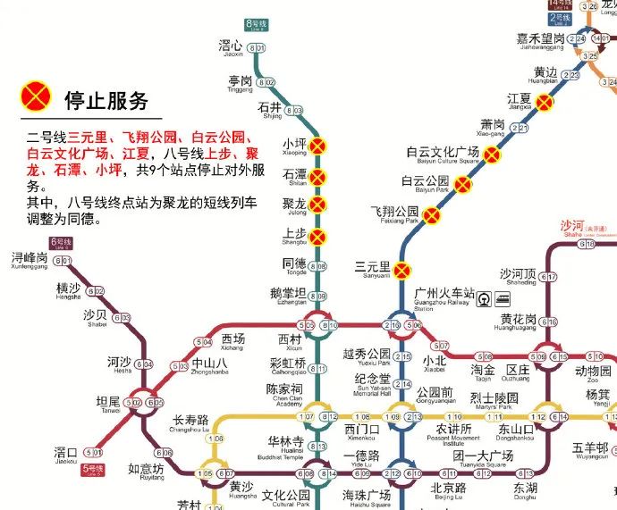 地铁服务方面,自2022年4月11日14:00起,广州地铁二号线江夏站停止对外服务、列车不停站运行。广州地铁9个站点停止对外服务:二号线三元里、飞翔公园、白云公园、白云文化广场、江夏,八号线上步、聚龙、石潭、小坪。其中,八号线终点站为聚龙的短线列车调整为同德。