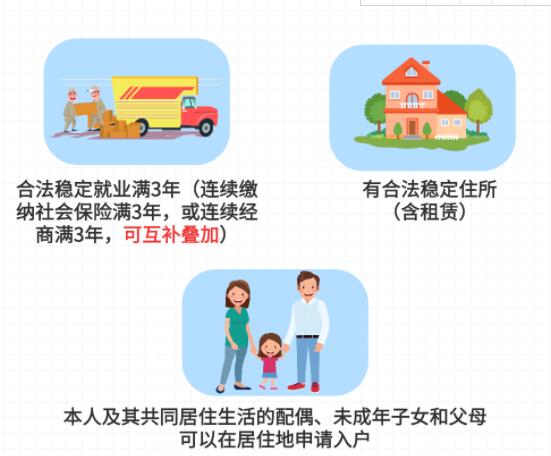 在我市合法稳定就业满3年(连续缴纳社会保险满3年,或连续经商满3年,可互补叠加),并有合法稳定住所(含租赁)的人员,本人及其共同居住生活的配偶、未成年子女和父母可以在居住地申请入户。