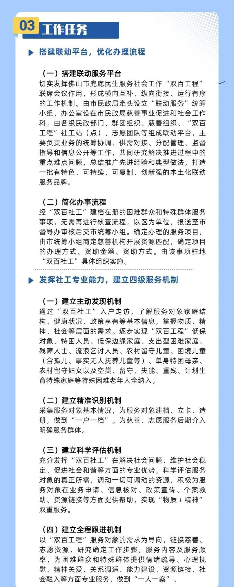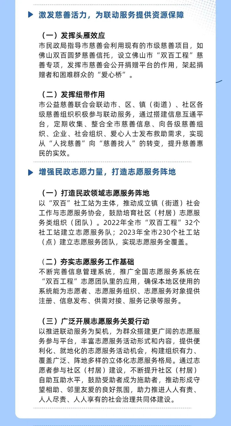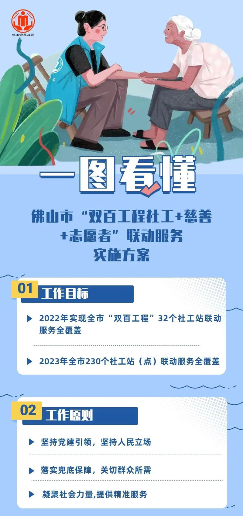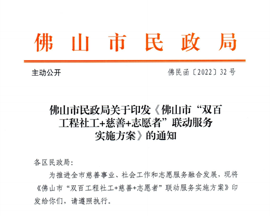 为更好地聚焦特殊群体、聚焦群众关切,进一步推进全市慈善事业、社会工作和志愿服务融合发展,近日,佛山市民政局印发了《佛山市“双百工程社工+慈善+志愿者”联动服务实施方案》。