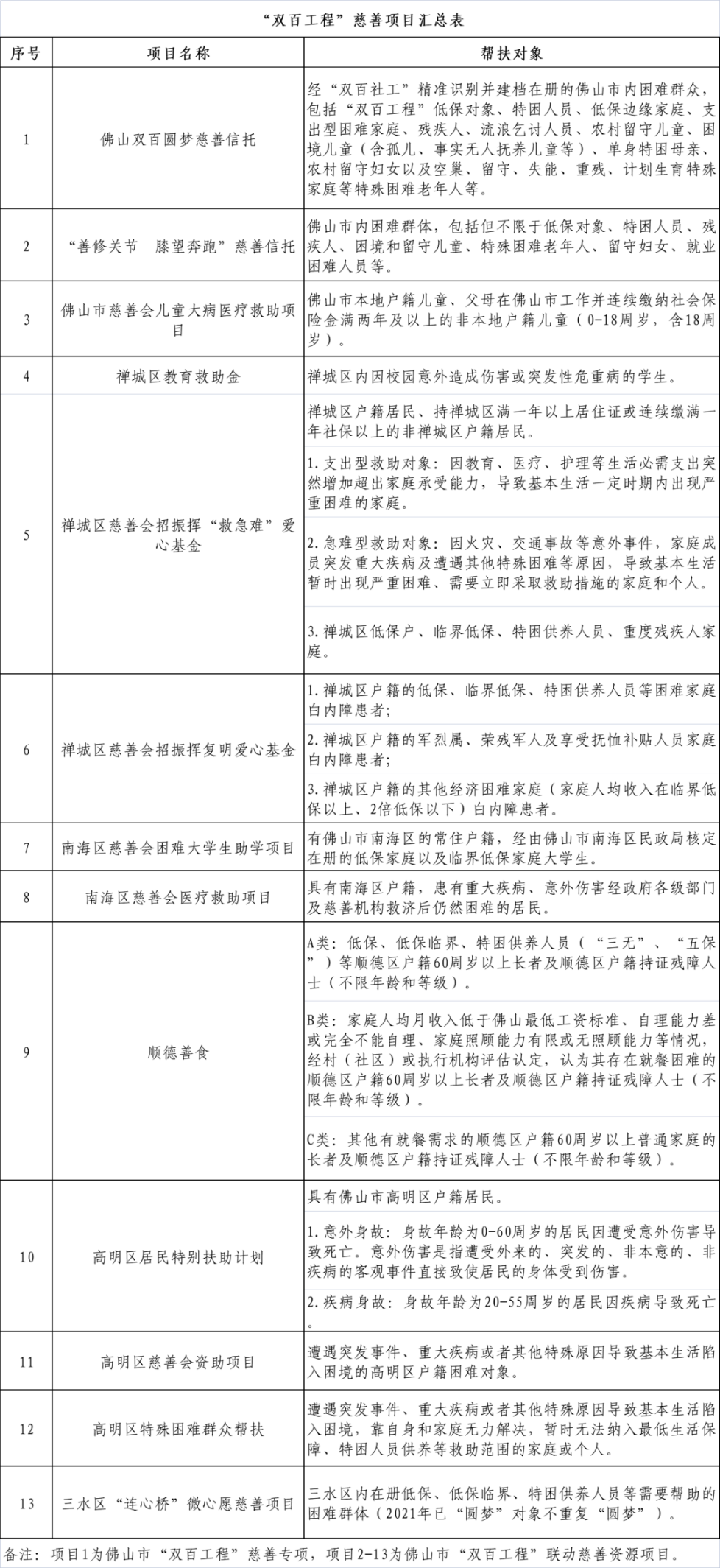 方案明确,佛山市慈善会要发挥头雁效应,利用现有的市级慈善项目,如佛山双百圆梦慈善信托,设立佛山市“双百工程”慈善专项,发挥市慈善会公开捐赠平台的作用,架起捐赠者和困难群众的“爱心桥”。佛山市公益慈善联合会联动市、区、镇(街道)、社区各级慈善组织积极参与联动服务,通过搭建信息互通平台,每半年收集、整合全市慈善信息,向各级慈善组织、企业、社会组织、爱心人士发布救助需求,实现从“人找慈善”向“慈善找人”的转变。截至目前,已联动13个慈善项目,共链接超1300万慈善资金。