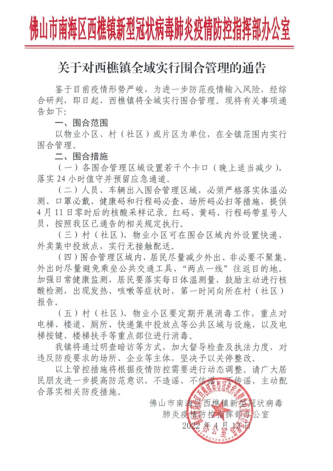 鉴于目前疫情形势严峻,为进一步防范疫情输入风险,经综合研判,即日起,西樵镇将全域实行围合管理。现将有关事项通告如下: