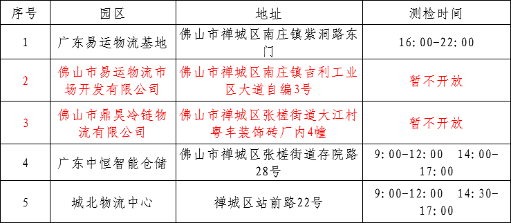 货车司机朋友们,为方便您来(返)禅城,禅城区已设立5个干线货车司机核酸检测点并提供免费核酸检测服务,请到如下地点进行免费核酸检测。