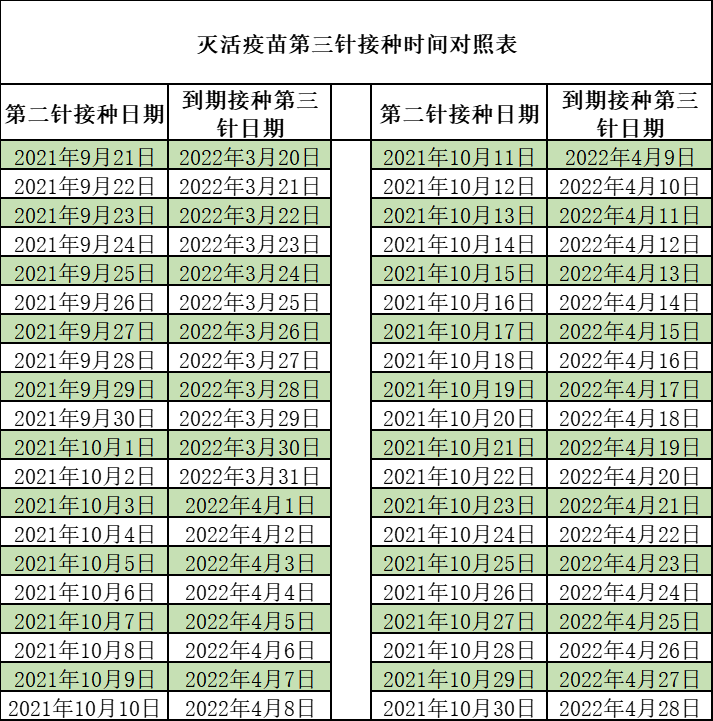 对照接种时间,比如2021年10月17日前(含10月17日)完成第二针接种的人群,2022年4月15日就可以接种第三针了。