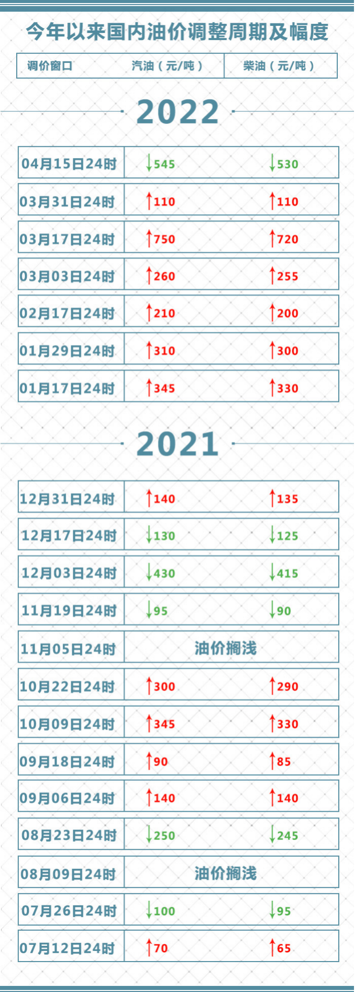 据国家发改委消息,本次油价调整具体情况如下:国内汽、柴油价格每吨分别下调545元和530元。