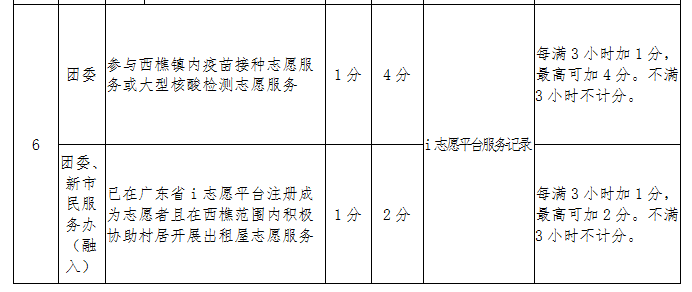 例子:志愿者A,总服务时长已有300小时,已获基本分60分,其中参与西樵镇核酸检测志愿服务有6小时,则额外可加2分。