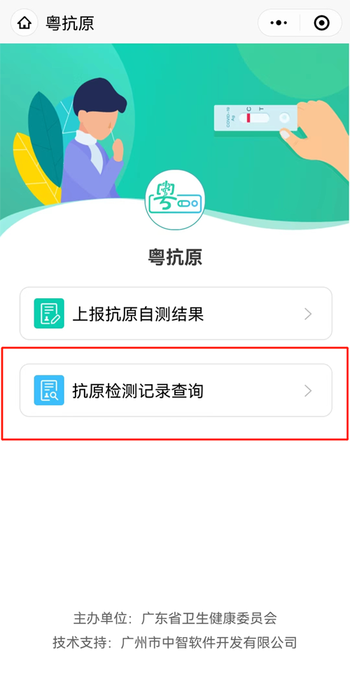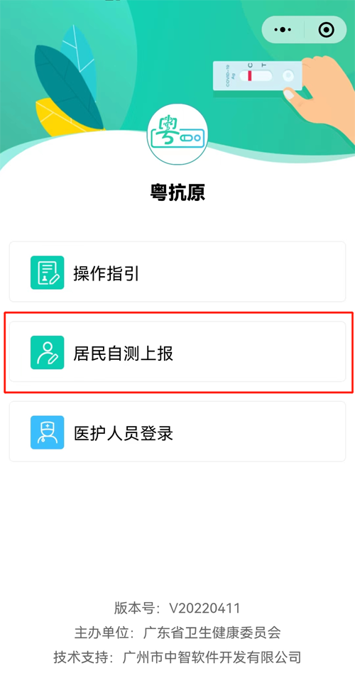1.打开微信,搜索“粤抗原”小程序,点击“居民自测上报”,选择“上报抗原自测结果”。