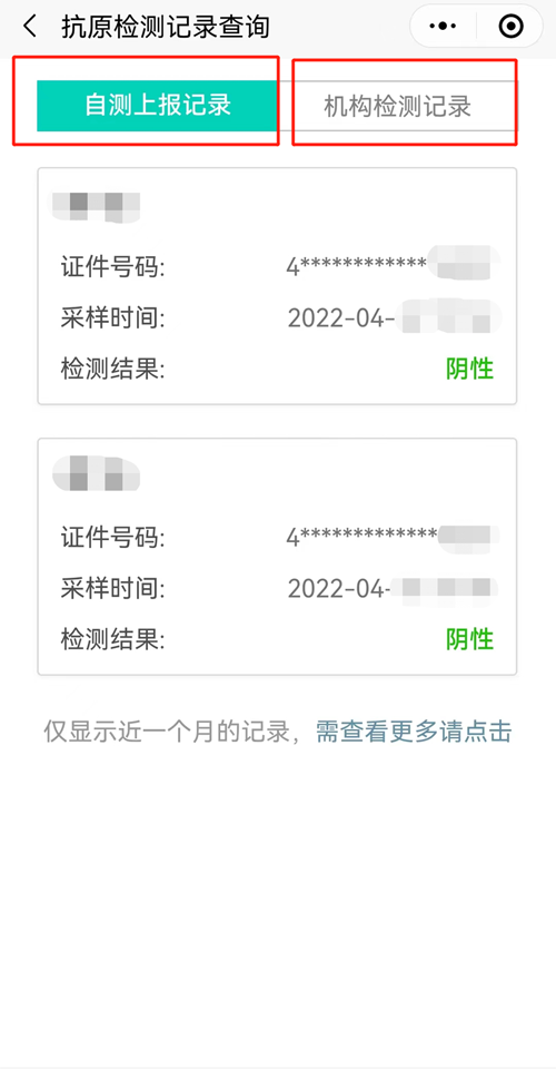 2.查看自测上报记录,点击记录查看明细;点击机构检测记录,人脸识别后,可查看受检人在机构抗原检测记录。