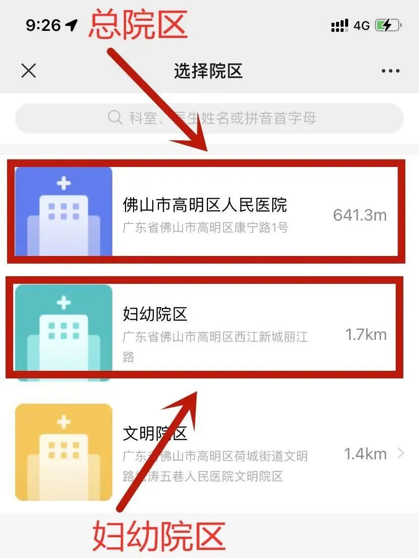 1. 进入并登陆高明区人民医院微信公众号“佛山市高明区人民医院”,点击“导诊”,进入“当天挂号”或“预约挂号”,选择“佛山市高明区人民医院”或“妇幼院区”;