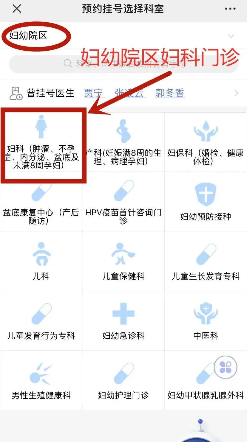 2、进入所选择的院区页面,点击妇科门诊,并根据自身安排进行挂号。