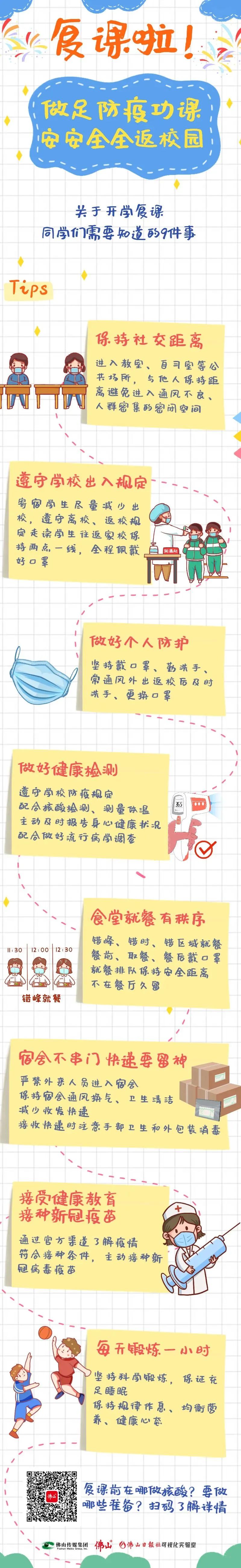 此外,返校后,各学校要严格按照市校园防控专班印发的《关于进一步做好学校新冠病毒核酸检测抽检工作的通知》(佛山教防组〔2022〕7号)做好核酸检测抽检工作。要结合疫情形势和学校疫情防控工作实际情况,进一步完善进出学校、教学、就餐、住宿、课外活动的卫生健康行为规范、过程规范,推行错峰制度,确保防控科学、规范、有序。