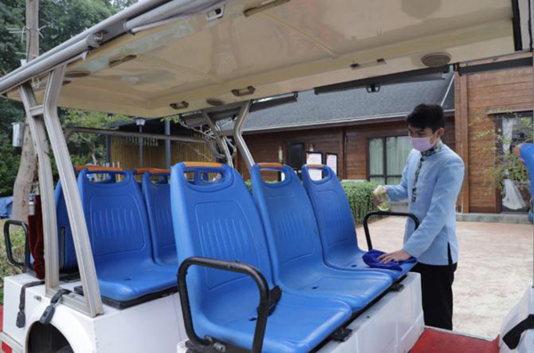 复业之际,景区严格落实疫情防控措施,对园区内外环境采取全方位消毒,对娱乐设备进行安全检测、给员工开展安全培训。