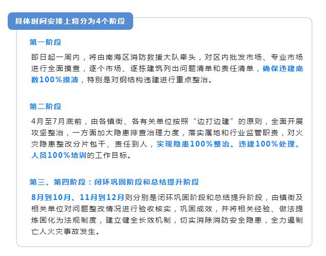 会议指出,南海区从即日起至12月31日,将全面排查整治南海区现有批发市场、专业市场存在的消防安全隐患,重点对市场管理方消防安全责任问题、市场内存在的各类违法违规行为,以及市场内人员消防安全培训情况三大方面内容进行综合整治,确保违建底数100%摸清,实现隐患100%整治、违建100%处理、人员100%培训的工作目标。