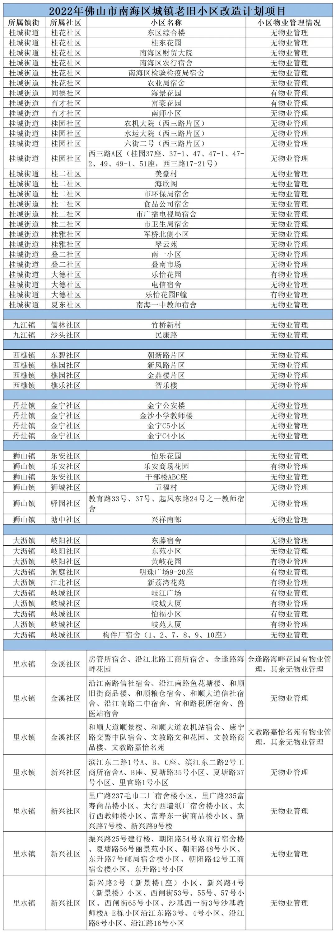 自2020年起,南海区住建水利局牵头推进城镇老旧小区改造改造工作,目标为对全区7个镇(街道)的城镇老旧小区进行补短板、微改造,完善基础配套设施,重点包括老旧小区内的路面、三线、水电气、绿化、照明、围墙、垃圾分类等基础类改造内容,以及与小区直接相关的社区服务设施等,同时对有条件的小区增加停车位、安装充电桩、预留加装电梯位置、修缮或增建物管用房等。