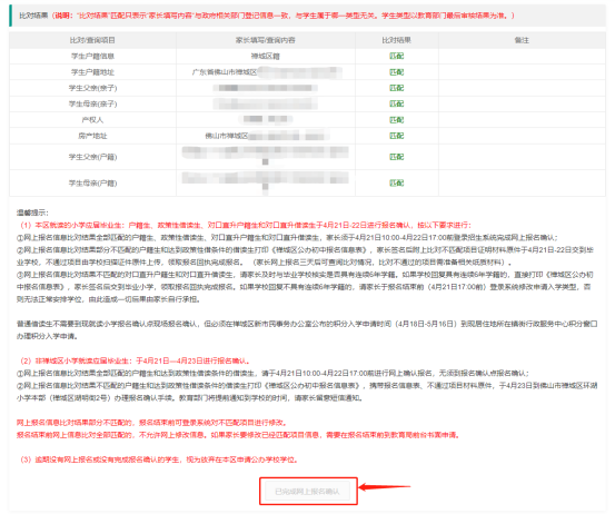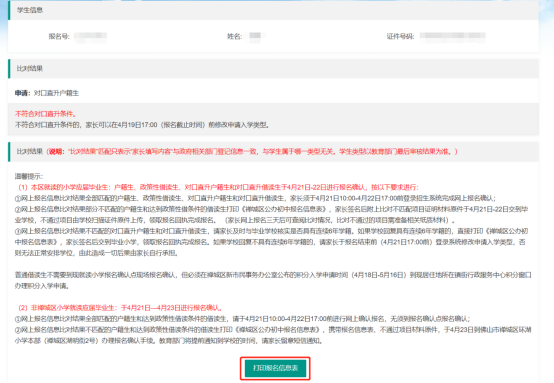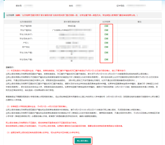 ●家长须于4月21日10:00-4月22日17:00前登录招生系统打印《禅城区公办初中报名信息表》并签名,附上比对不匹配项目证明材料原件于4月21日-22日交到毕业学校验证审核。