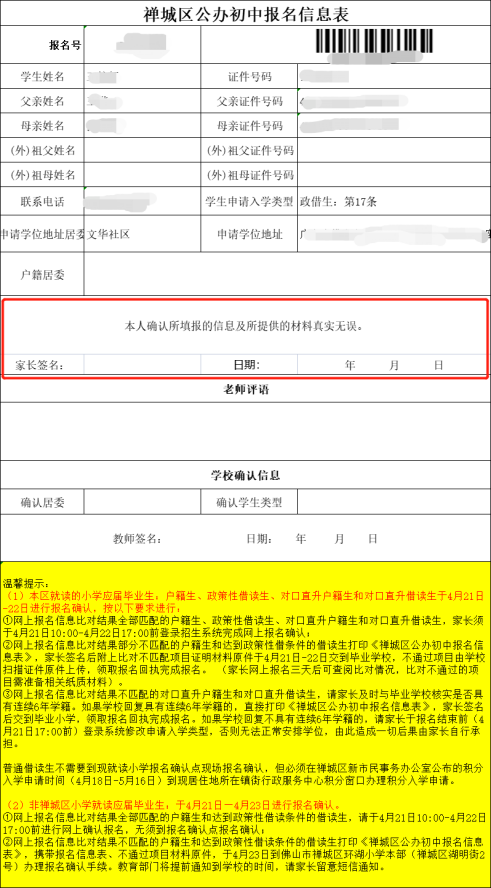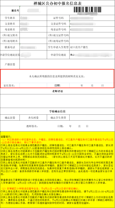 第四步:打印《禅城区公办初中报名信息表》→家长签名,并在4月21日-22日携带《禅城区公办初中报名信息表》和不匹配项目证明材料原件到毕业学校进行现场报名确认。