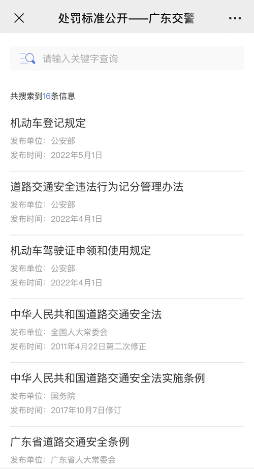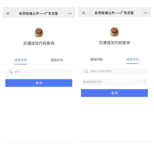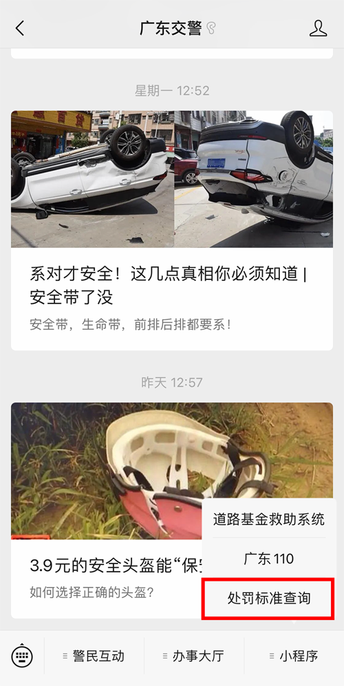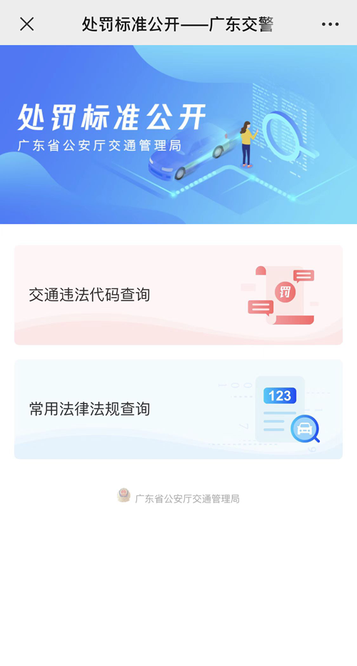 关注“广东交警”微信公众号,点击菜单栏【小程序】,点击【处罚标准查询】,进入查询界面。